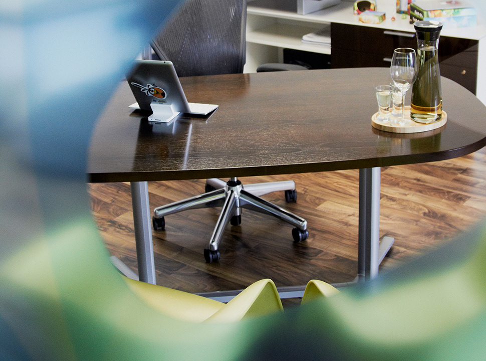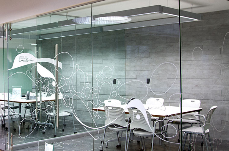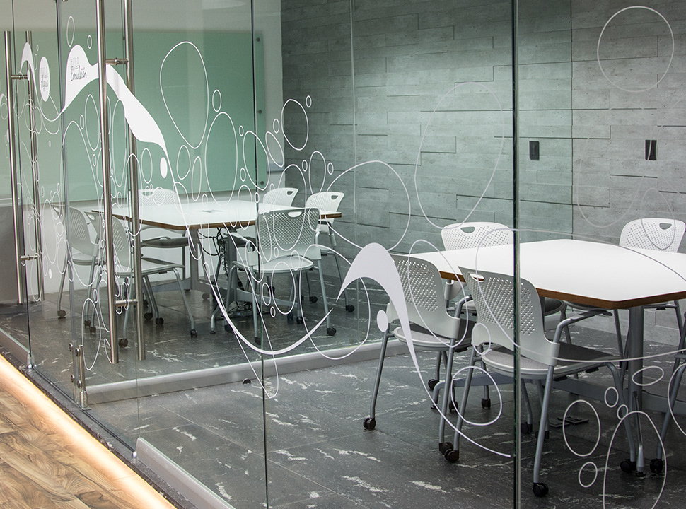 Décoration graphique représentant par des formes abstraites l’essence même du produit vendu par la société.